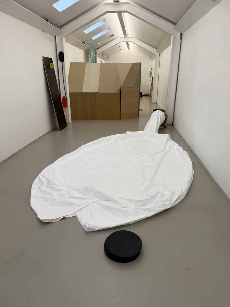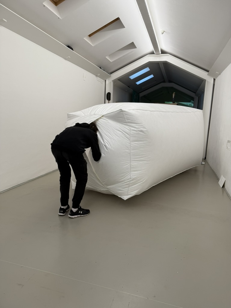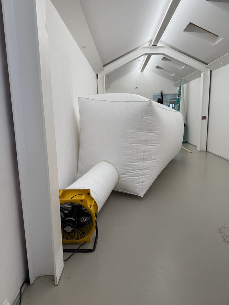 Tyvek, genäht, Luftzustrom durch Axialventilator Trotec 4.500. Innenraum begehbar.